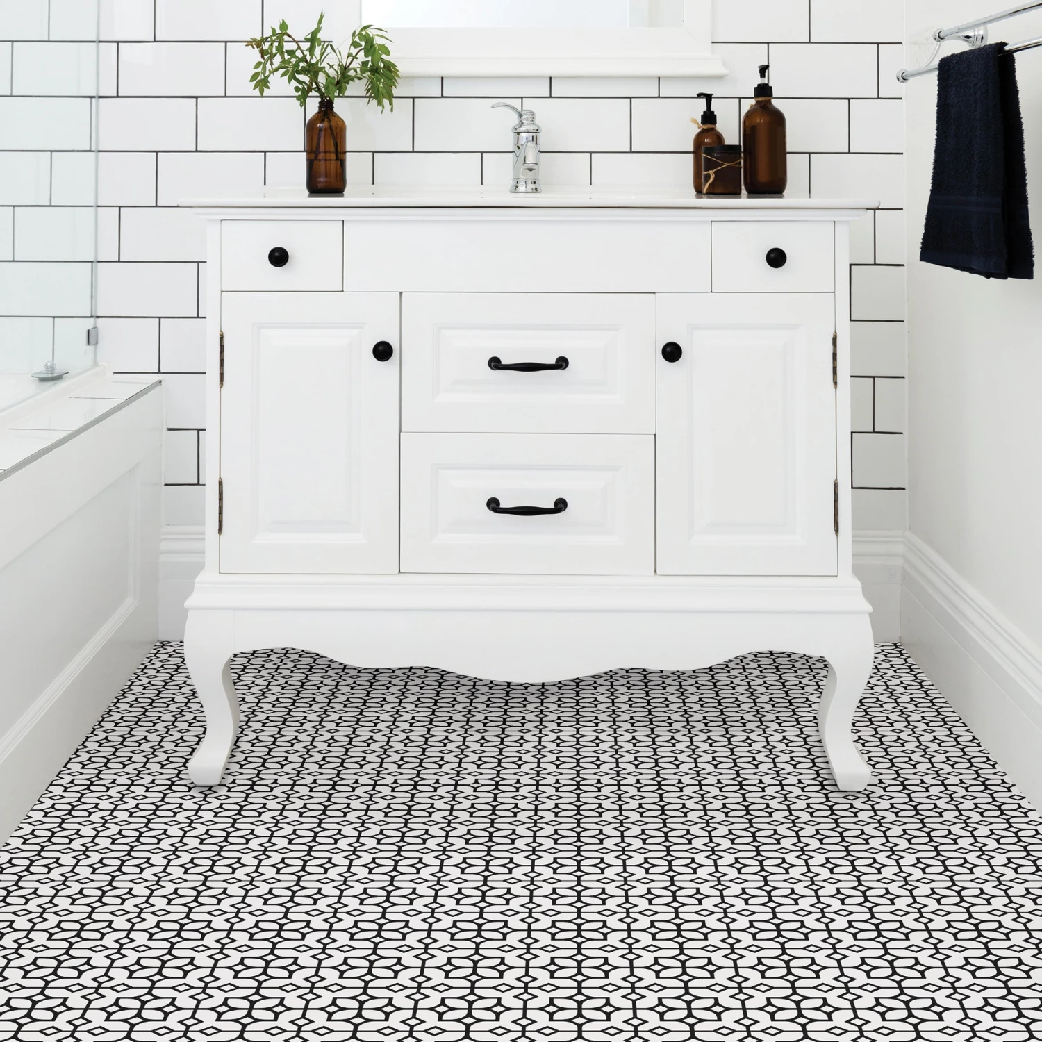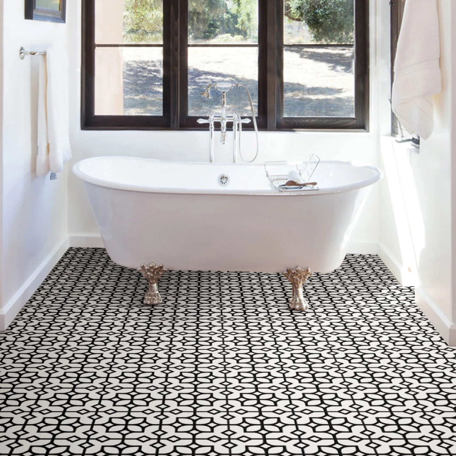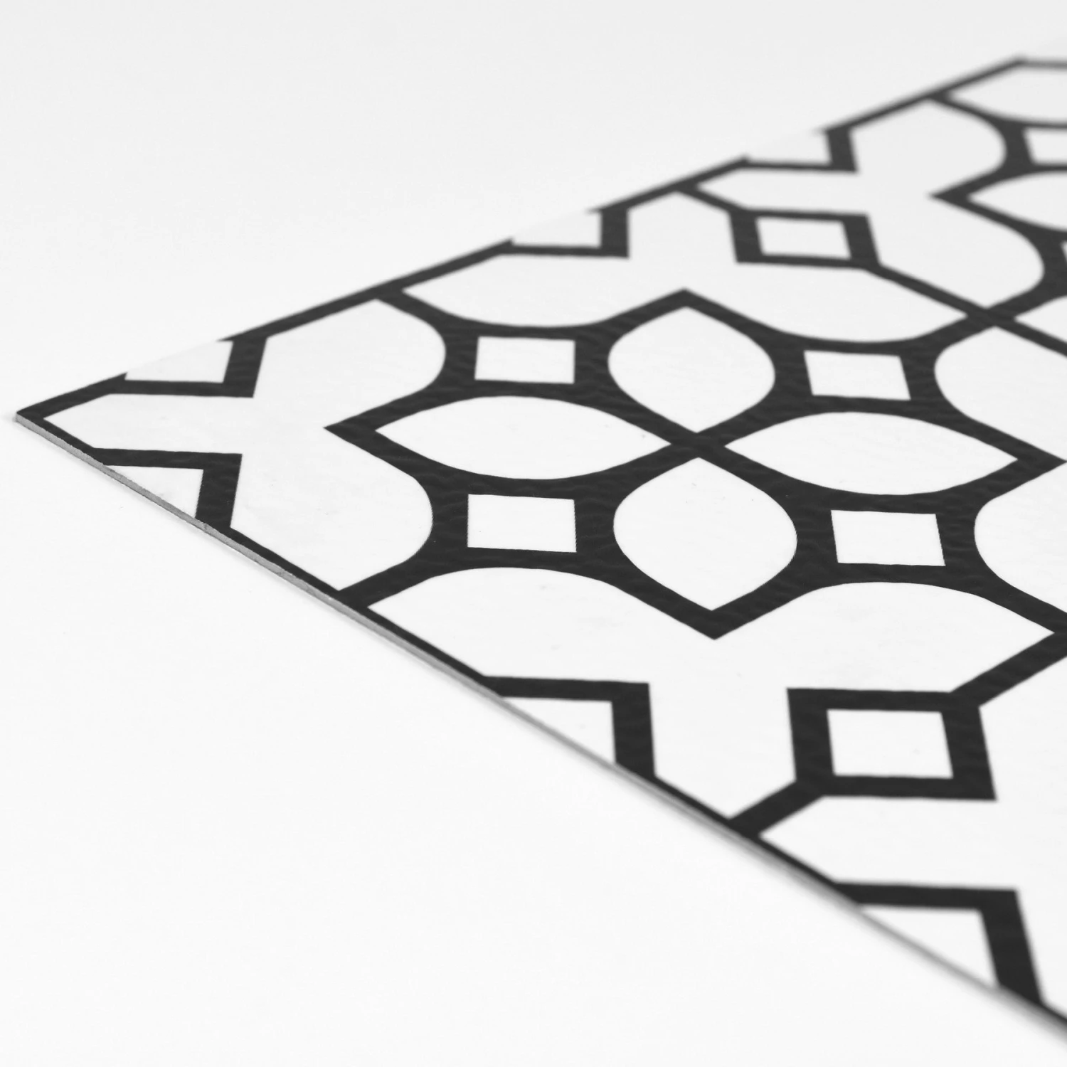 Create a classic and stylish look with these black and white peel and stick floor tiles. The geometric design has an ironwork flair perfect for a variety of rooms. Abbey Peel and Stick Floor Tiles contains 10 pieces on 10 sheets that measure 12 x 12 inches. This product measures 60 x 24 x 0.06 when assembled.