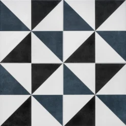 This House Beautiful tile is a larger format tile from their Cube collection. Windmill boasts a black, white and blue smaller scale ‘half and half’ pattern. These tiles feature an encaustic effect, which creates a chalky like matt finish. Each tile has pre-scored lines that create the effect of four smaller tiles, but make installation much easier. They’re both beautiful and practical. Monochromatic colours make it easier to create inspiring feature walls or floors. The durability of porcelain makes these tiles suitable for any space in your home, including high-traffic areas. Windmill makes achieving the half and half look much easier as the pattern is ready to go, all you have to do is install it!