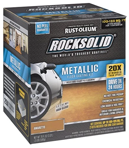 Rocksolid Metallic Floor Coating contains pearlescent and iridescent accents that produce marbleized gleaming finishes. These lustrous floor coatings are the newest solution for commercial applications, retail environments and for many residential customers looking to set their home apart from others. Our stunning, easy to install metallic systems are great for any garage, basement, bathroom, or interior living spaces. 20X stronger than epoxy Walk on in 8-10 hours and drive on 24 hours Extreme high gloss Impervious to chemicals Low odor and VOC free No hot tire pickup Self-leveling buildable Eco-safe Easy-mix burst pouch FOR BEST RESULTS Install between 40°-90°F AVAILABLE SIZES 70 fl. Oz. Kit Cover up to 100-125 Sq. Ft. 2 Kits needed for 1 Car Garage. KIT CONTENTS Polycuramine Burst Pouch, Metallic Tint, Polyamide Roller, Stir Stick and Instructions.Rust-Oleum 299741 RockSolid Polycuramine Metallic Floor Coating Amaretto 70oz Kit (need 2 for 1 Car Garage)